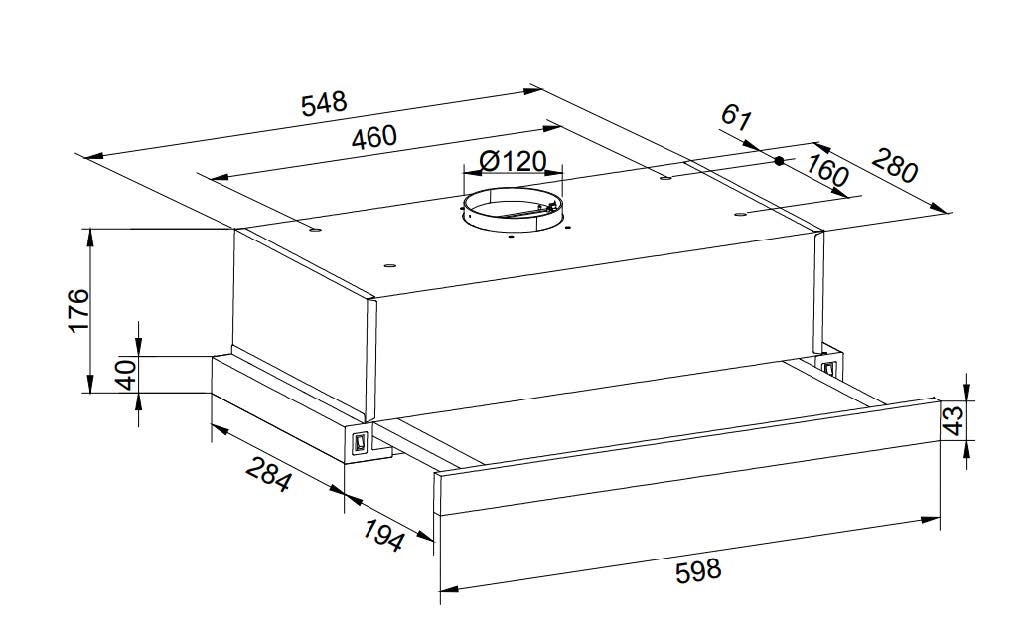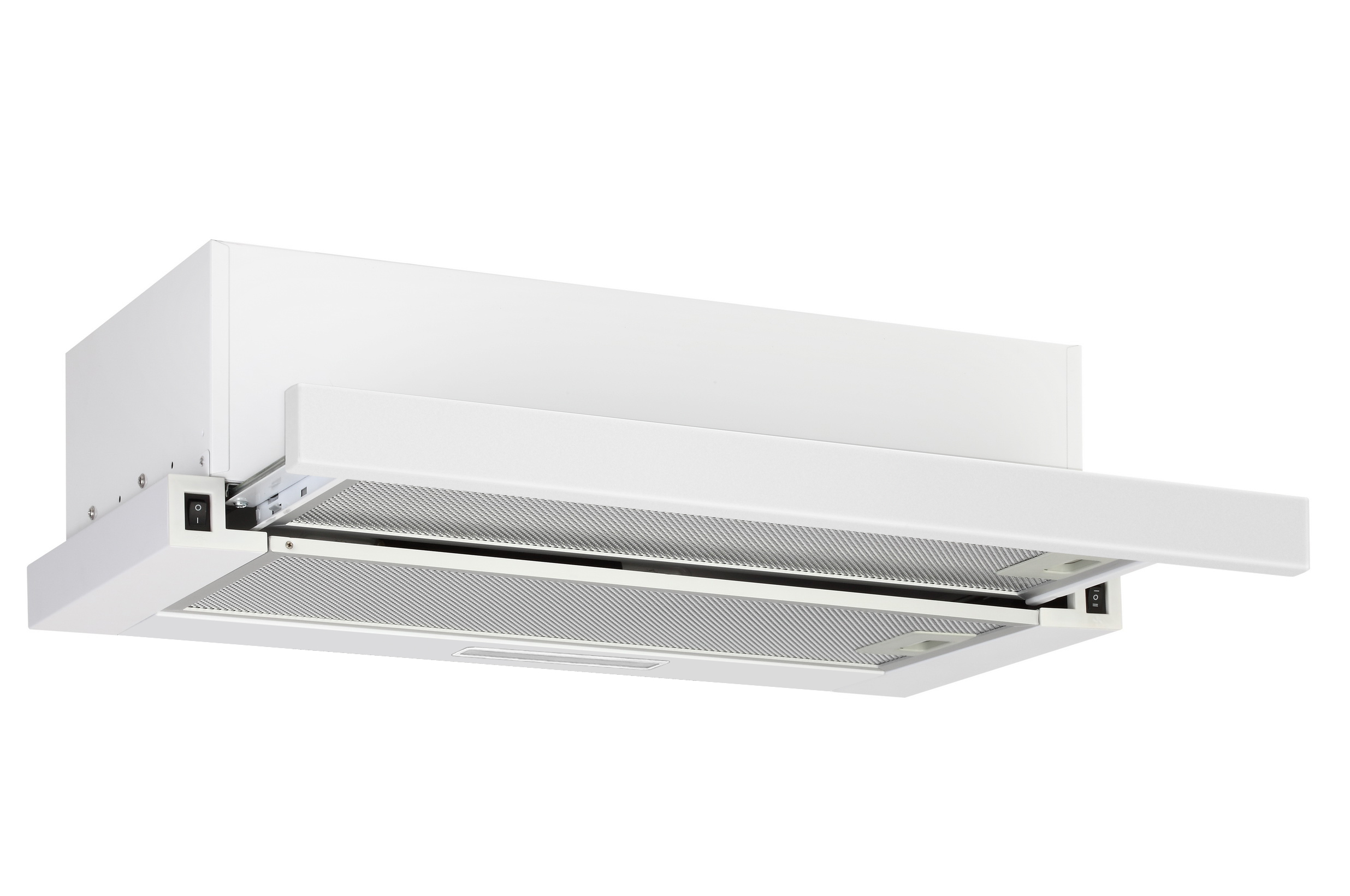 Hotă telescopică încorporată, lățime 60 cm, evacuare, 650 m3/oră (motor turbo), bară frontală - sticlă albă, 3 viteze, iluminare LED (1*4W), diametru evacuare aer 120 mm