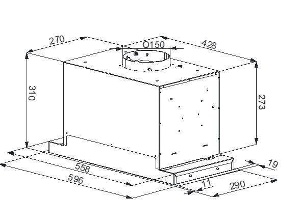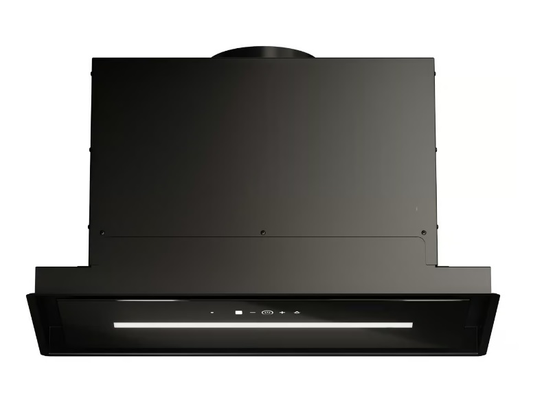 Hotă încorporată cu față din sticlă neagră. Control tactil + telecomandă. Motor ECCO italian avansat, turbocompresor, capacitate de 1000 m³/oră, 4 viteze de funcționare, diametru de ieșire de 150 mm, dimensiuni 59,6 × 29 × 31 cm. Evacuare/recirculare (necesită 2 filtre FILTRU DE CARBON FDUEEL V0 BACKER - 36106)