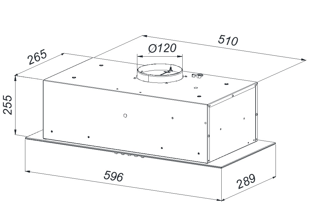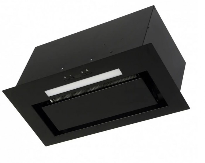Hotă încorporată cu față din sticlă neagră. Electronică cu afișaj și telecomandă. Motor ESCOP italian avansat cu turbocompresor, capacitate de 800 m³/oră, 4 viteze de funcționare, diametru evacuare 150 mm, dimensiuni 28,9 × 59,6 × 25,5 cm. Evacuare/recirculare (necesită adaptor filtru carbon și filtru carbon).